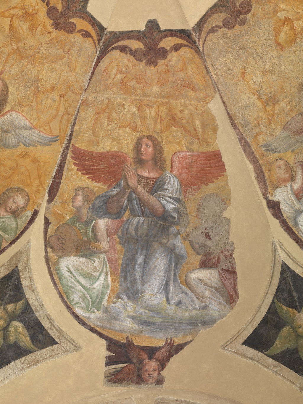 Angelo orante tra due angeli musicanti inginocchiati e schiere di cherubini; un cherubino rosato a quattro ali