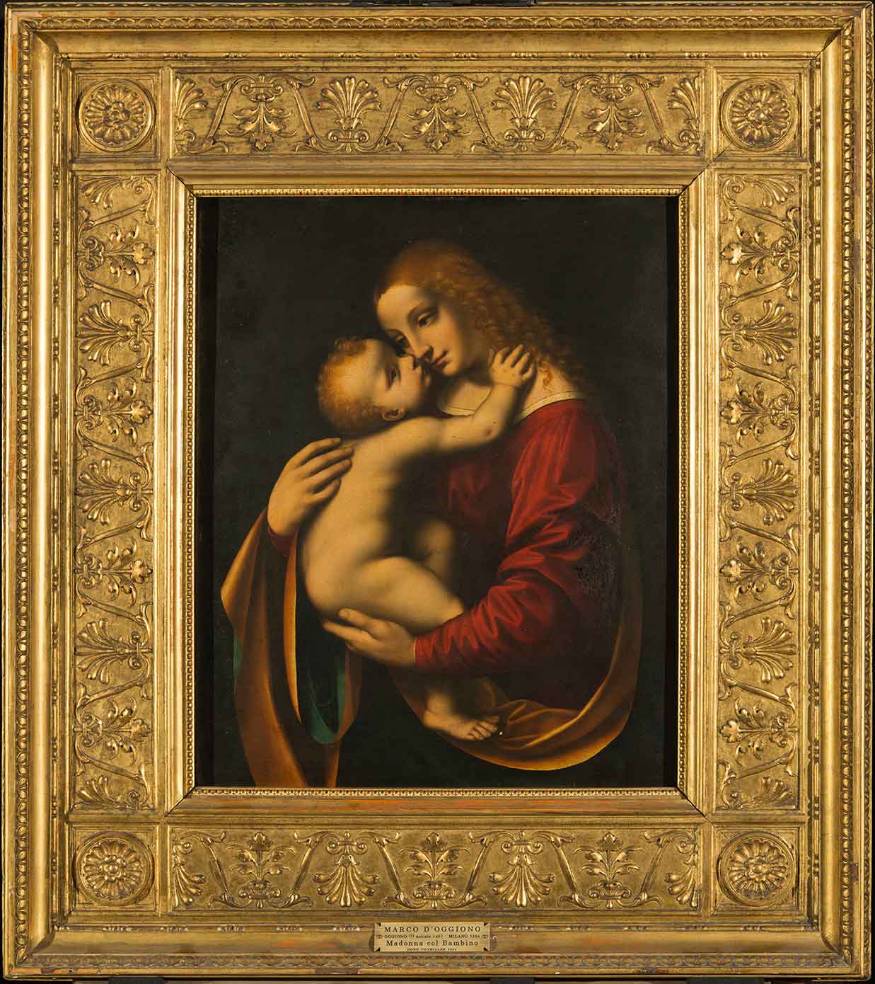 “Madonna con il Bambino” (1525) di Marco d’Oggiono apparteneva alla collezione di Giuseppina Cereda Rovelli, che nel 1872 la prestò alla mostra tenutasi a Brera in quell’anno. Passata nella raccolta Vonwiller, nel 1934 fu destinata con legato testamentario all’Accademia di Brera. Un documento conservato presso la Soprintendenza attesta invece che fu consegnata alla Pinacoteca l’anno successivo.