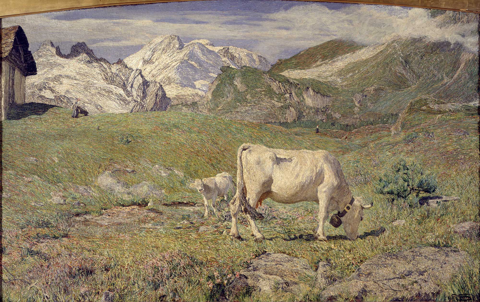 Rientrò nel mercato antiquario nel 1949 e fu acquistato su segnalazione di Fernanda Wittgens da Carlo Pesenti, all’epoca presidente dell’Associazione Amici di Brera. Il soggetto naturalista del paesaggio montano, trattato a sottili pennellate di colori puri accostate secondo la tecnica del divisionismo, è interpretato dall’artista in chiave simbolista, entro un’atmosfera serena e intensamente lirica.