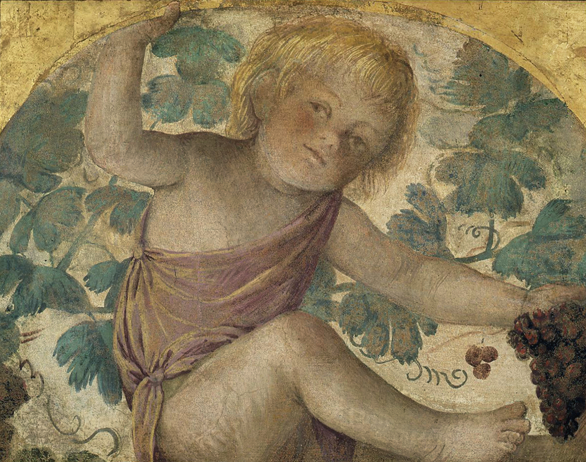L’affresco proviene da una piccola stanza della villa. Le lunette con i putti dovevano essere originariamente dieci e si trovavano sotto l’imposta di una volta interamente decorata con tralci di vite. Il tema vegetale sarebbe desunto dallo stemma di Gerolamo Rabia scolpito sul camino della Sala Grande e la volta doveva essere concepita come una finta pergola: un’idea ripresa dalla decorazione della Sala delle Asse del Castello Sforzesco di Milano, realizzata da Leonardo da Vinci pochi anni prima. I puttini, con la loro illuminazione radente, rivelano l’influenza su Luini di Bramantino, in passato ritenuto autore di quello bellissimo al centro.