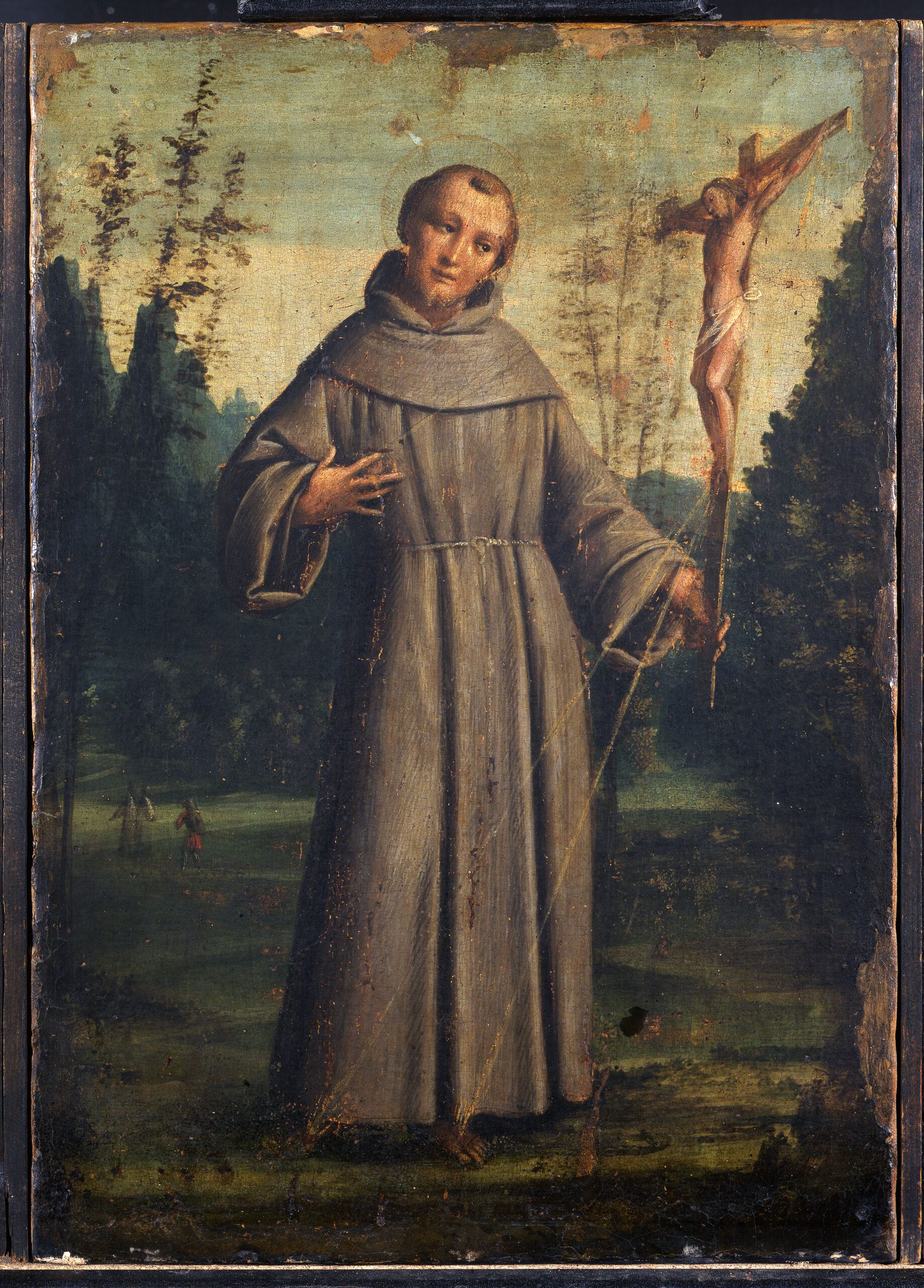 Il dipinto è pervenuto alla Pinacoteca di Brera con il legato di Pietro Oggioni, nel 1855. Caratterizza questa piccola immagine devozionale del Santo, immerso in estatica contemplazione del crocifisso in un suggestivo e trascolorante sfondo di paese, la stesura accurata e l’esecuzione che ossessivamente ripropone in punta di pennello la fitta trama pittorico-chiaroscurale, derivata dall’inconfondibile matrice di Gaudenzio Ferrari.