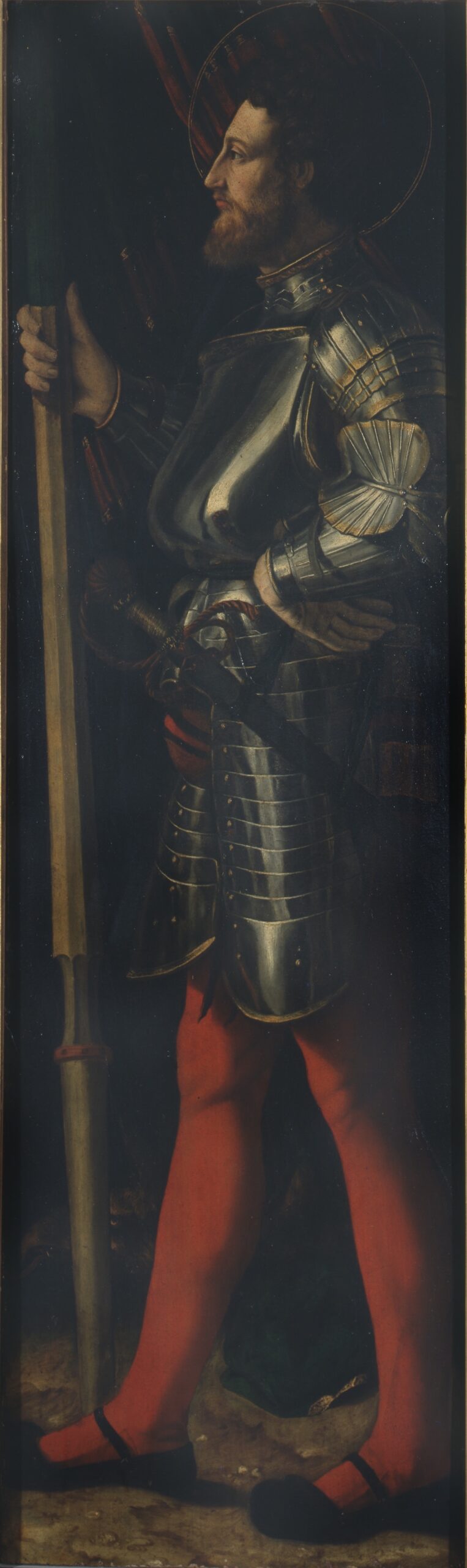 Insieme a San Giovanni Battista costituiva il pannello laterale di un trittico, al cui centro era una Madonna con il Bambino e san Giovannino su tavola di cui si ha notizia sino al 1822. I riferimenti stilistici più immediati, per quest’opera, si colgono con La Stregoneria alla Galleria degli Uffizi a Firenze, che dovrebbe collocarsi intorno al 1542; analogo è il punto di cristallizzazione formale con cui l’ultimo Dosso “romanista” perviene anche mediante il viraggio della sua più consueta esuberanza cromatica verso tagli di luce nitidi e scultorei. Nel volto del san Giorgio sono state riconosciute le fattezze di Francesco d’Este, signore di Massa Lombarda, cittadina da cui le opere provengono, e probabile committente del dipinto.