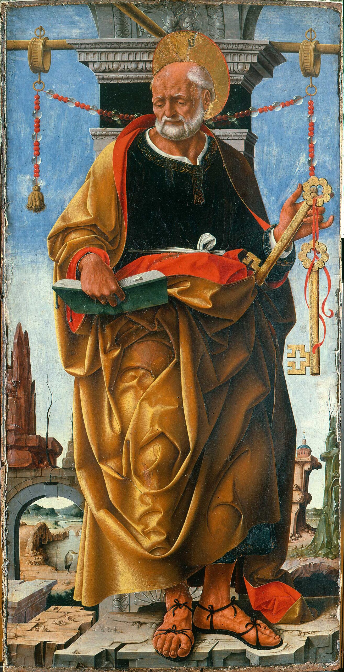 I due santi si presentano con la solidità di due sculture policrome, poggiati su di un terreno scheggiato che li isola come un basamento oltre al quale si apre un paesaggio fantastico, dove archi pericolanti inquadrano pianure percorse da fiumi e punteggiate da costruzioni.