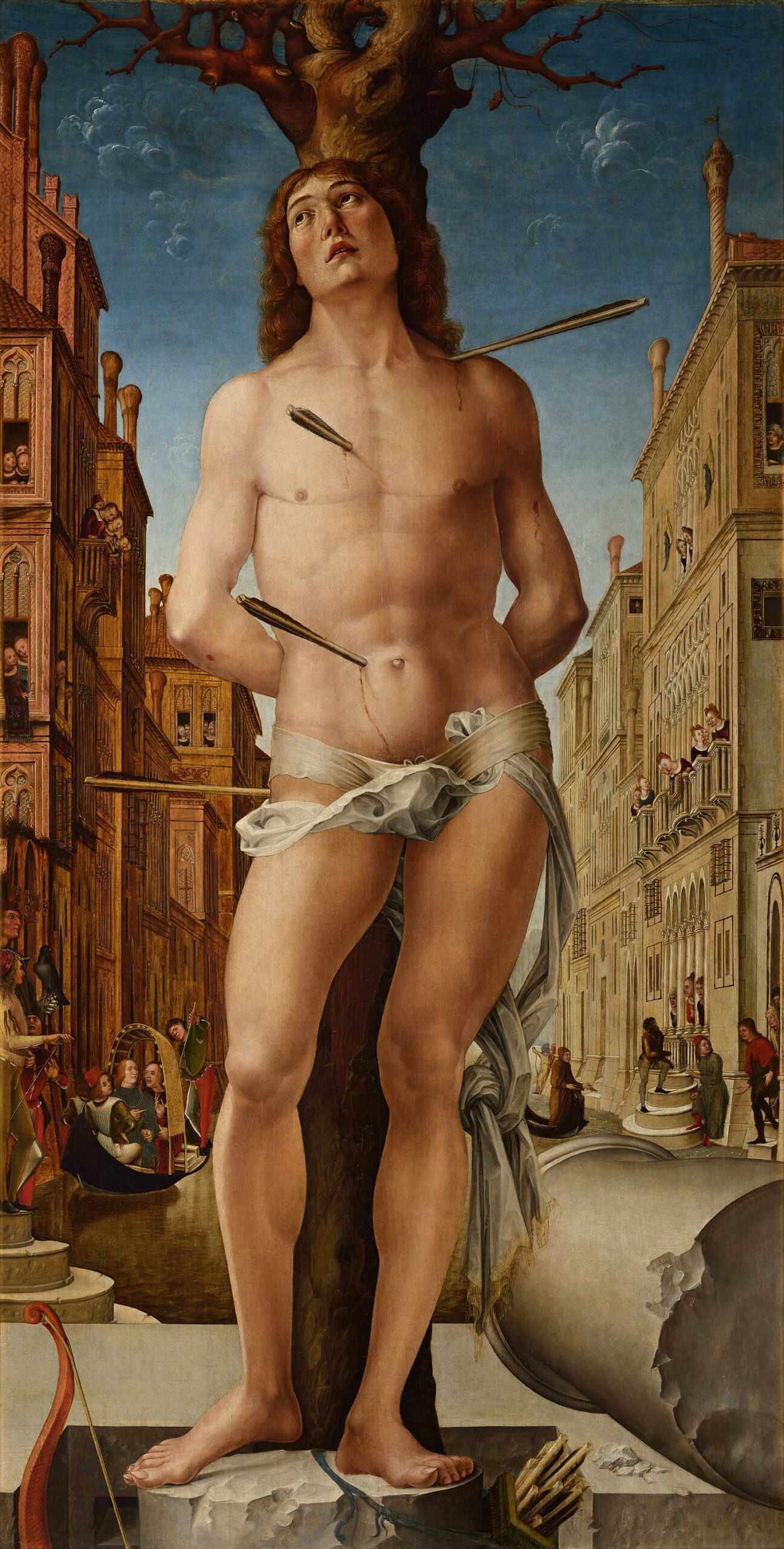 La bellezza del giovane Sebastiano ne faceva un soggetto irresistibile per gli artisti, ansiosi di dar prova della loro capacitá di rendere l’anatomia umana. L’immagine che ne risultava era spesso quella di una sofferenza estatica, quasi erotica addirittura. Questo Sebastiano è diverso. La colonna romana spezzata parla di storia, ma lo sfondo è un brulicante paesaggio urbano del Quattrocento, reso magistralmente nel dettaglio. Lo scontro di tutta questa vita con la sofferenza solitaria riveste un soggetto antico con un dramma nuovo, e sfida l’occhio a spostarsi dall’uno all’altro.