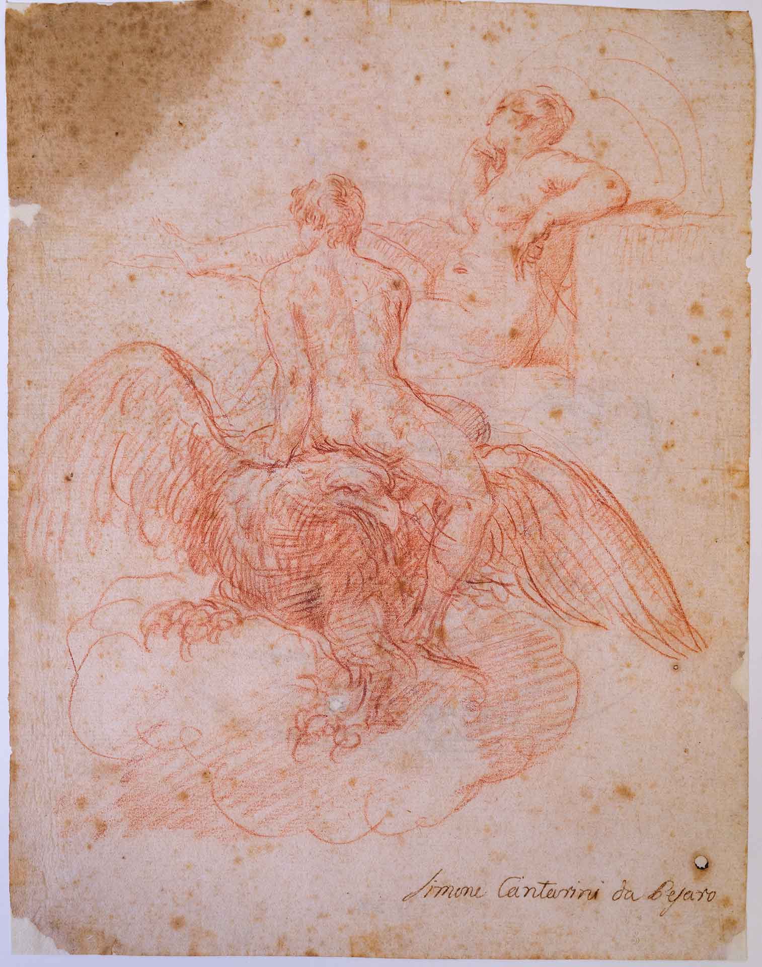 Sul verso del disegno in parola un cerchio contiene l’immagine di Giove che bacia Ganimede, ripetuta più in alto e più piccola fuori dalla cornice tonda. Ganimede qui simboleggia Amore e infatti ha le ali sul dorso, l’arco in mano e la faretra. Una sanguigna molto vicina a questa, con accanto Giove Cupido in piedi, si trova nella collezione Gordon di New York (18 Febbraio 1991, lot. 221)
