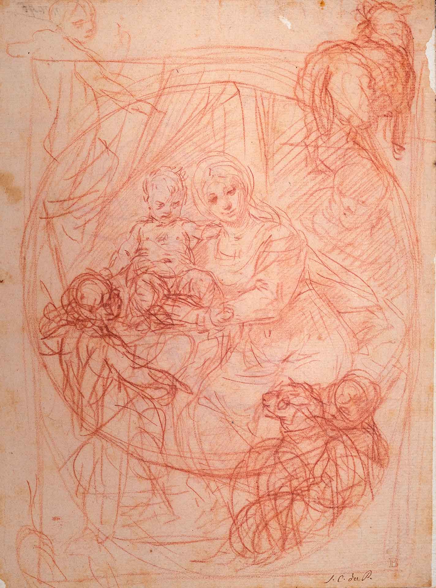 Rispetto a quelle il nostro disegno conserva l’aspetto di studio in fieri, con la presenza di prove tracciate velocemente attorno alla cornice: due agnelli, dei quali quello più in basso risulta da un sapiente groviglio di linee in cui l’artista riesce a studiare anche due diverse pose per i movimenti della testa e almeno due schizzi ancora, uno, in alto a sinistra, per il san Giovannino, l’altro, più in basso, per Gesù Bambino. San Giuseppe è appena accennato dietro la Vergine.