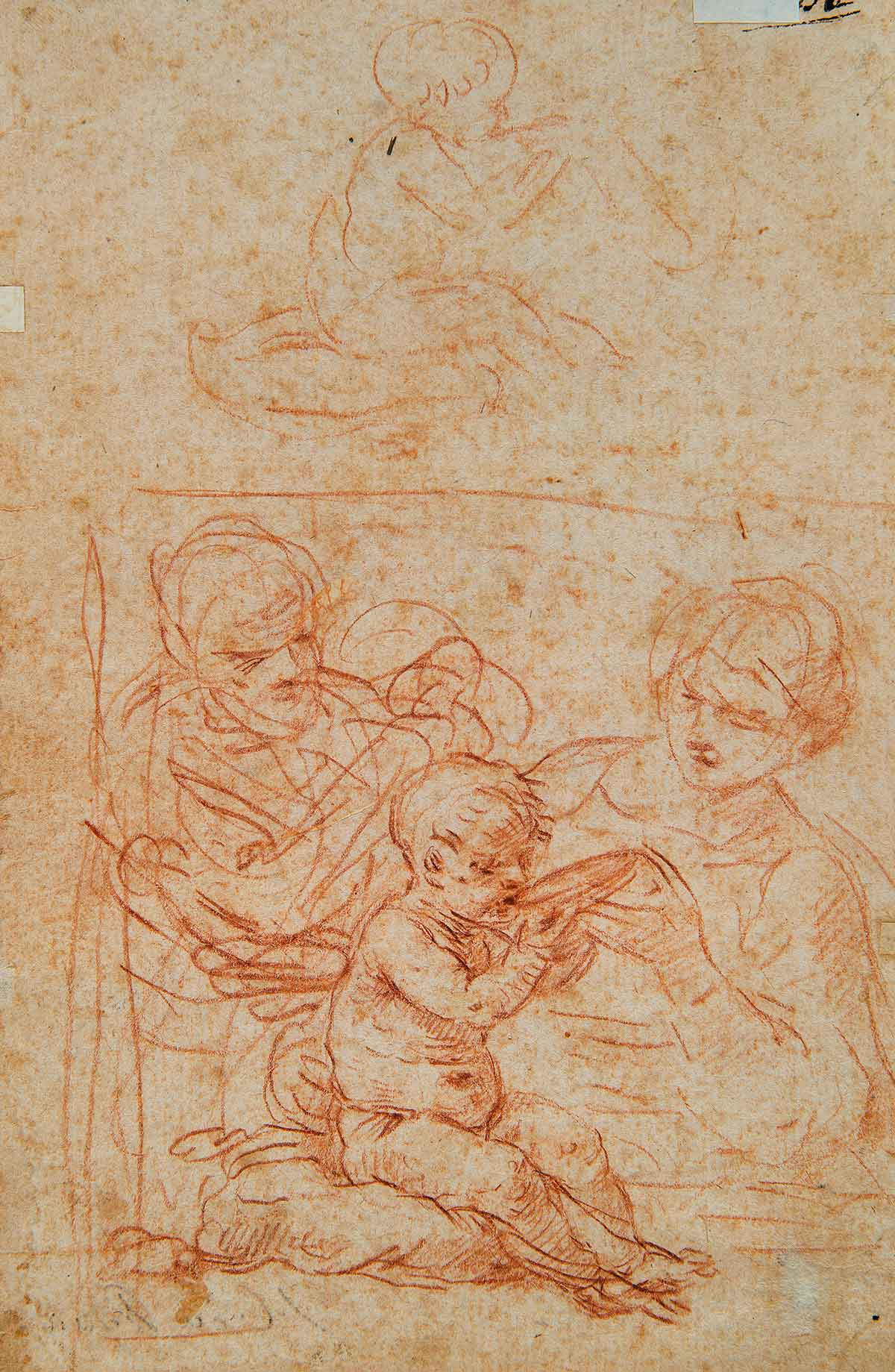 Il disegno più completo per questa composizione si trova a Rio de Janeiro (Biblioteca Nacional; Ambrosini Massari 1996, n.66, p.120). È una sanguigna in controparte rispetto all’incisione, dove la Vergine è tracciata a figura intera e compare anche la figura del san Giuseppe di lato che sostiene il ricco tendaggio.