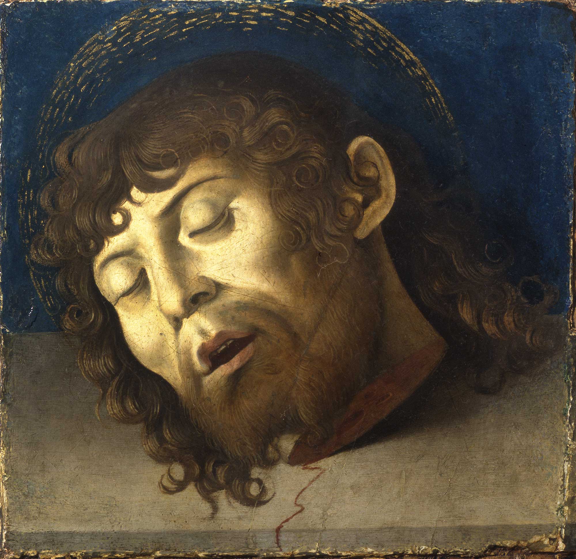 L’opera è giunta in Pinacoteca dalla chiesa dei Frati Minori Osservanti di Cotignola, presso Ravenna, nel 1811. Non è chiaro se faceva parte di un’opera di maggiori dimensioni, dove poteva essere un elemento della predella, insieme all’Incoronazione della Vergine e L’Imbalsamazione di Cristo, oppure se era stata progettata come opera a se stante. L’iconografia della testa del Battista infatti, quale immagine indipendente, di piccole dimensioni e destinata ad un culto privato, è ampiamente testimoniata in area settentrionale, lombarda e padana. Si trattava di un motivo certamente in auge presso gli ordini e le confraternite per la sua forte caratterizzazione pietistica, ed era utilizzato spesso come reliquiario o raffigurazione destinata alla meditazione.