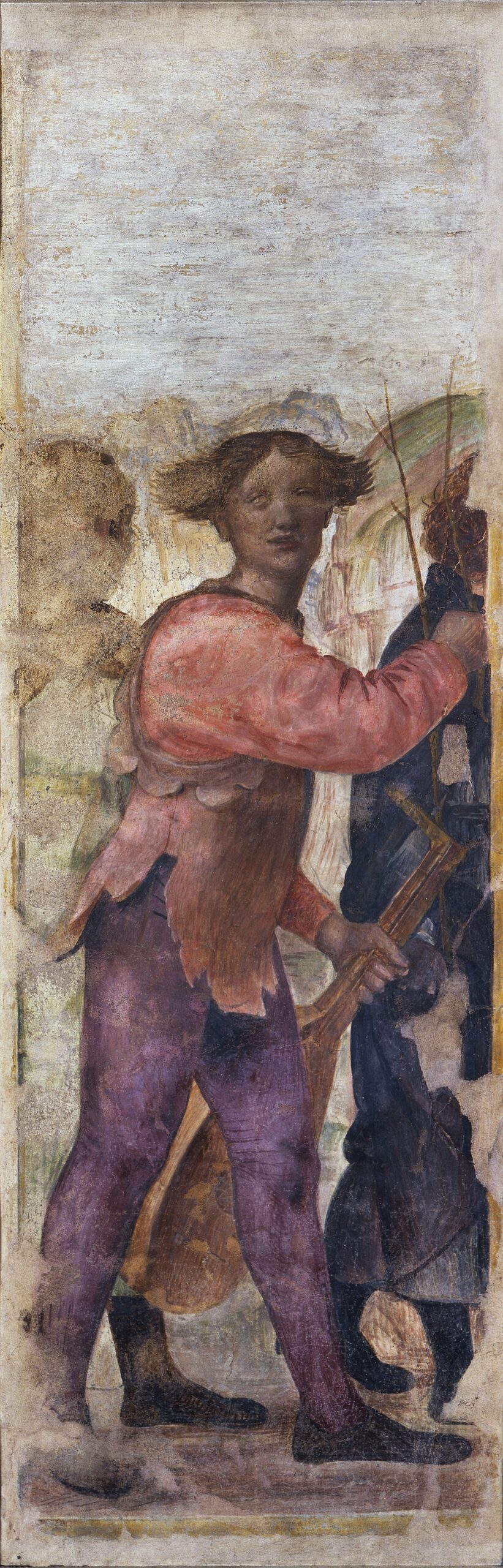 Dopo la soppressione di Santa Maria della Pace a Milano quale luogo di culto, gli affreschi di Bernardino Luini entrarono a Brera, in diverse fasi, fra il 1805 e il 1875. L’aspetto originario della cappella di San Giuseppe, un corpo quadrangolare addossato al presbiterio al termine della navata sinistra, è in parte restituito da un acquarello di Ludovico Pogliaghi, che la ritrae poco prima del distacco degli ultimi brani, quelli della volta e della parete d’ingresso, con tracce delle cornici in stucco che inquadravano le scene sulle pareti. Lo stato frammentario in cui gli affreschi sono pervenuti impedisce una sicura ricostruzione del ciclo, che comunque, almeno per la scena raffigurante San Giuseppe eletto sposo della Vergine, deve esser letto in rapporto all’Apocalypsis Nova, il testo del beato Amedeo Mendez da Silva, fondatore della corrente dei francescani Amadeiti e del convento della Pace, e più in generale all’impulso dato dall’ordine al culto mariano tra la fine del Quattrocento e i primi del Cinquecento.