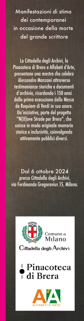 Nell’ambito del progetto N(U)ove Strade per Brera la Cittadella degli Archivi, la Pinacoteca di Brera e Alfabeti d’Arte, hanno realizzato la mostra “Omaggio a Manzoni – Manifestazioni di Stima dei Contemporanei in Occasione della Morte del Grande Scrittore”.