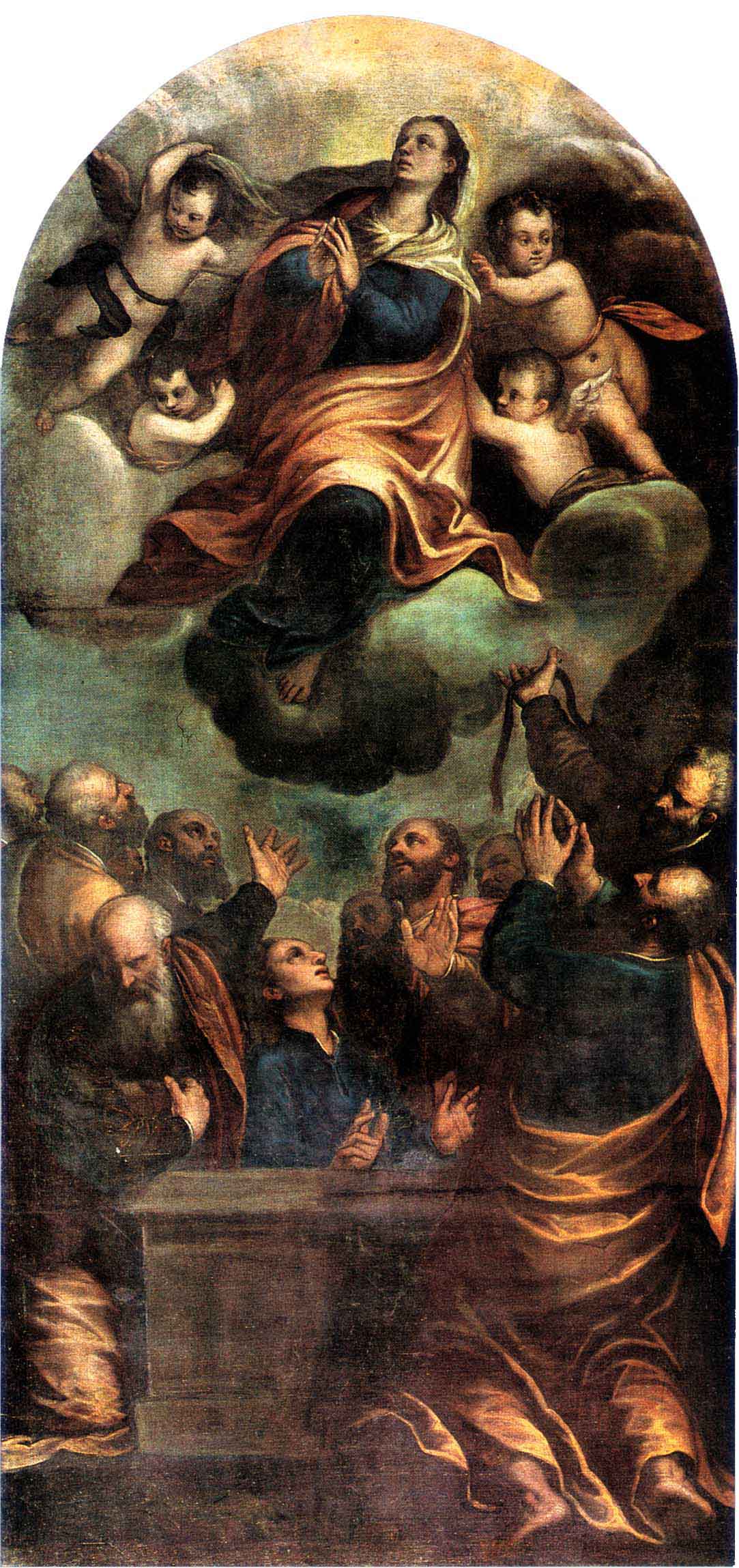 Rispetto all’iconografia tradizionale, il dipinto si arricchisce dell’episodio dell’apostolo Tommaso con la mano destra sollevata a esibire la cintura ottenuta dalla Madonna come prova della veridicità della sua Assunzione. La tela proviene dalla chiesa di Santa Chiara a Vicenza, commissionata dalla gentildonna locale Quieta Fratina Trissina nel 1592. Appartiene a uno dei momenti più felici della produzione dell’artista, che dimostra di aver riflettuto a fondo sull’opera di Palma il Giovane.