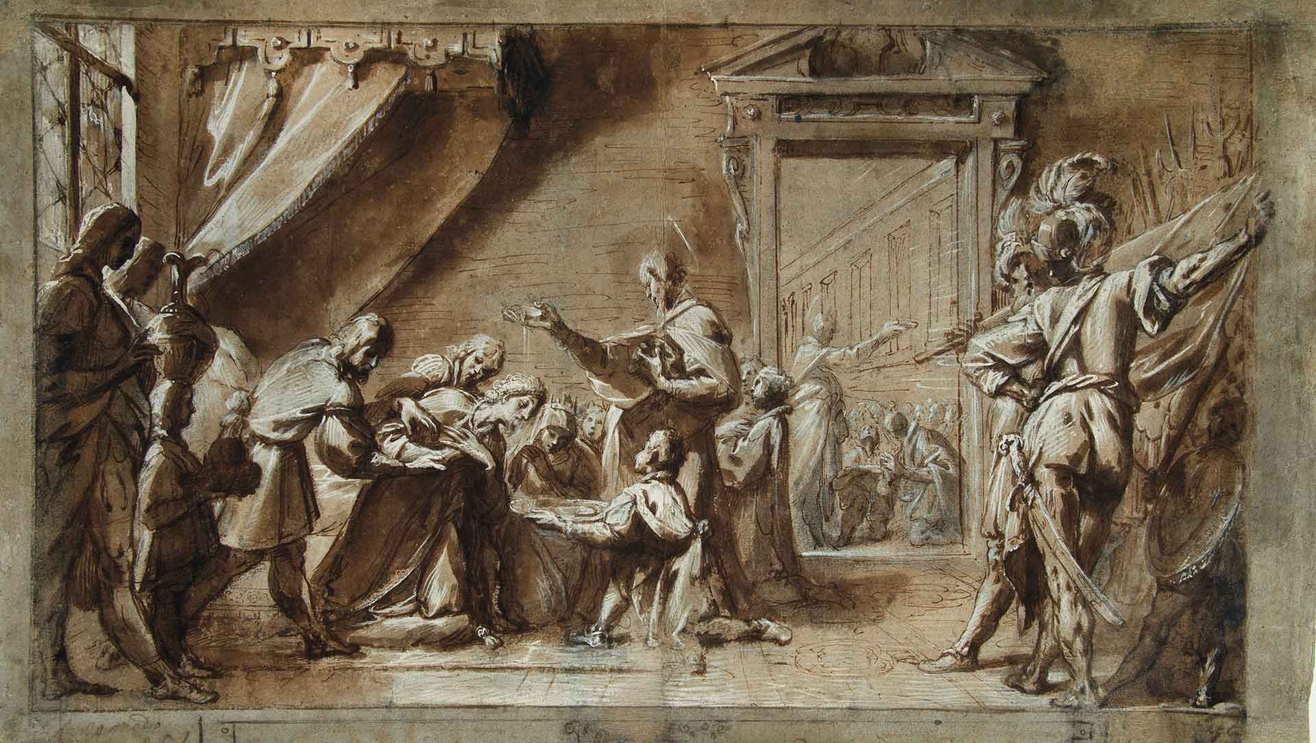 I due disegni sono entrati in Pinacoteca per lascito del conte Massimiliano Cesare Stampa, marchese di Soncino (atto rogato il 21 maggio 1876), attribuiti al Morazzone e descritti come “bozzetti a chiaroscuro” raffiguranti “sacrificio di vari martiri” e “battesimo di un principe”.
