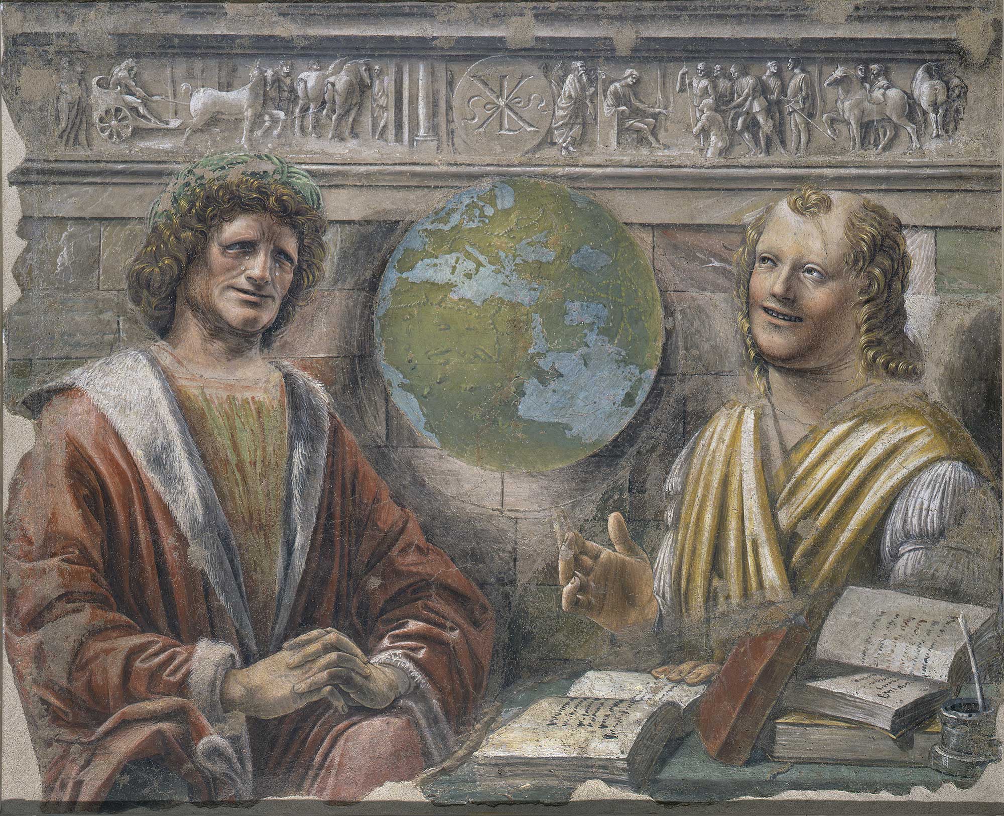 Lomazzo also cites the figures of Heraclitus and Democritus, set above a door, the first weeping and the second laughing, as examples of representation of the “motions of the mind.” The fact that the fragment representing the two ancient philosophers was located in a different room from the Men-at-Arms, presumably that “of the school,” is confirmed by its different scale and by the testimony of Venanzio De Pagave, who at the end of the 18th century, in the manuscript of the Dialogo fra un forestiere ed un pittore che si incontrano nella basilica di San Francesco Grande in Milano (Biblioteca d’Arte del Castello Sforzesco, Milan), specifies that Heraclitus and Democritus was in another room.