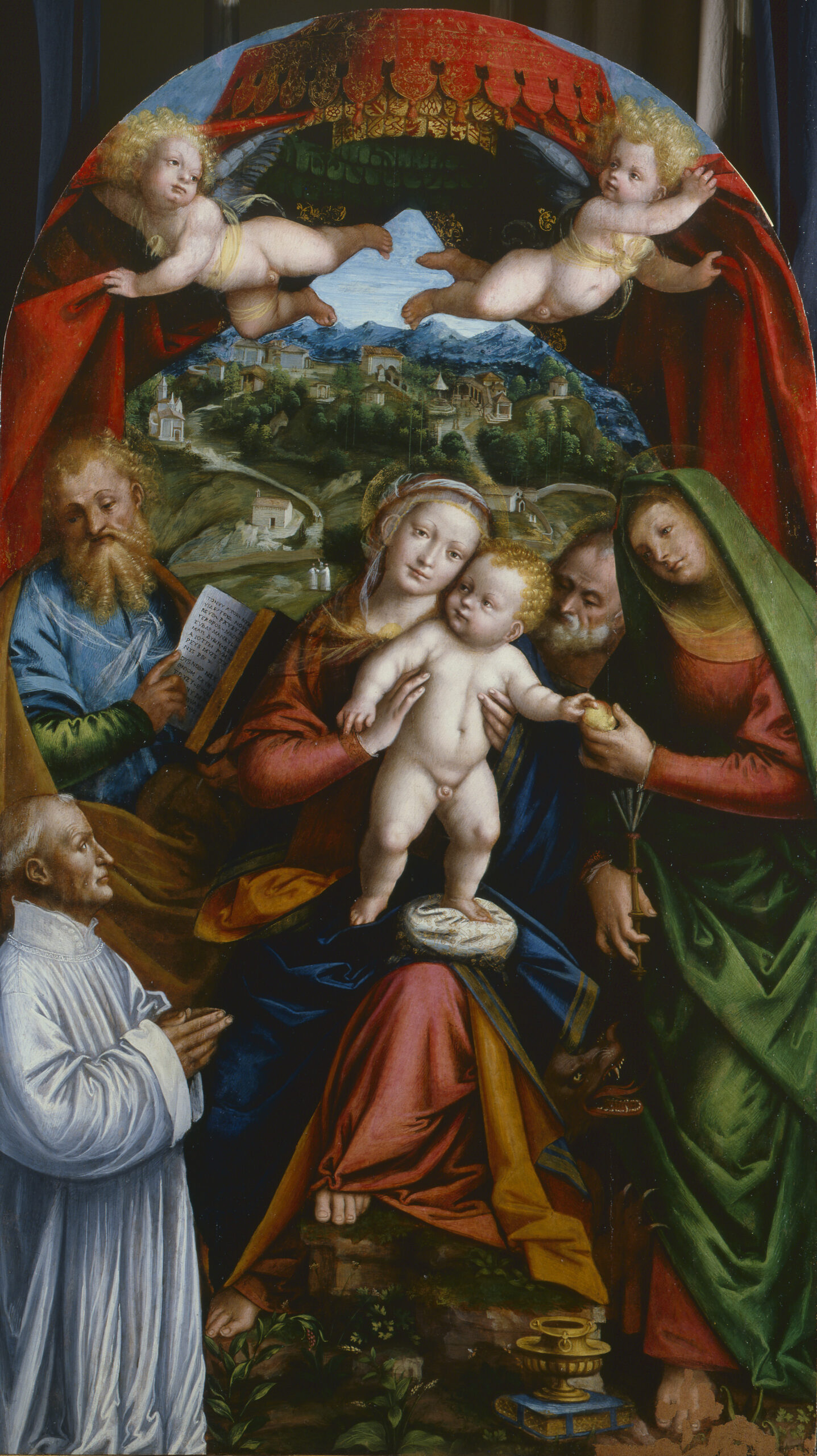Two dishevelled angels hold back the curtains of a canopy to reveal the Sacro Monte di Varallo as it was at the time, with the complexes of Nazareth and Bethlehem and the Chapel of Calvary. In front of it, saints and an as yet unidentified donor in the habit of a Canon Regular of the Lateran flock around the Virgin. Gerolamo Giovenone, from a family of artists, drew close to Gaudenzio Ferrari around 1515 and went on to exchange drawings and models with him.