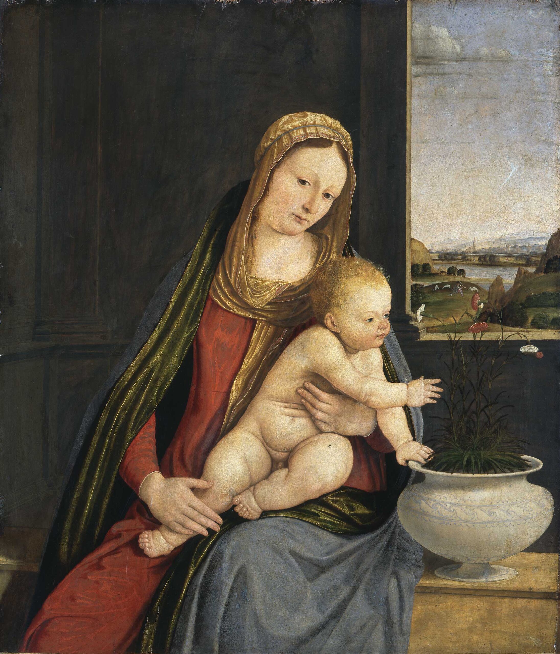 Andrea Solario painted the Madonna of the Carnations at the start of his career when he was in Venice with his brother Cristoforo, a sculptor, in the early 1490s. The Christ Child’s posture is inspired by Leonardo, while the style is influenced by the painters Andrea met in Venice: Giovanni Bellini, Alvise Vivarini, Perugino, Antonello da Messina and Albrecht Dürer. The shadow in the room contrasts with the luminous landscape, where a shepherd plays the flute and a horseman rides past in the distance.