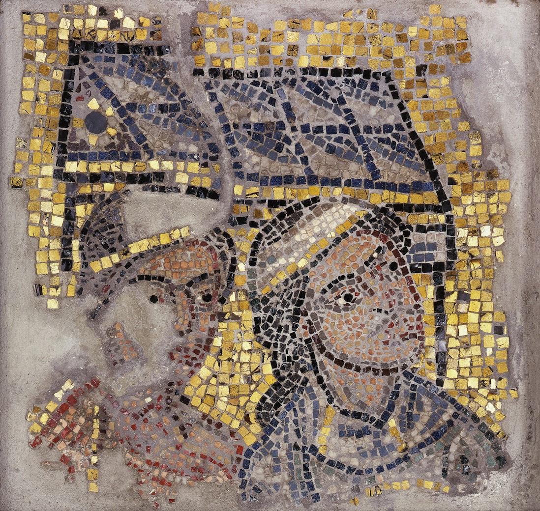 Mosaic With Two Heads and a Building in the Background