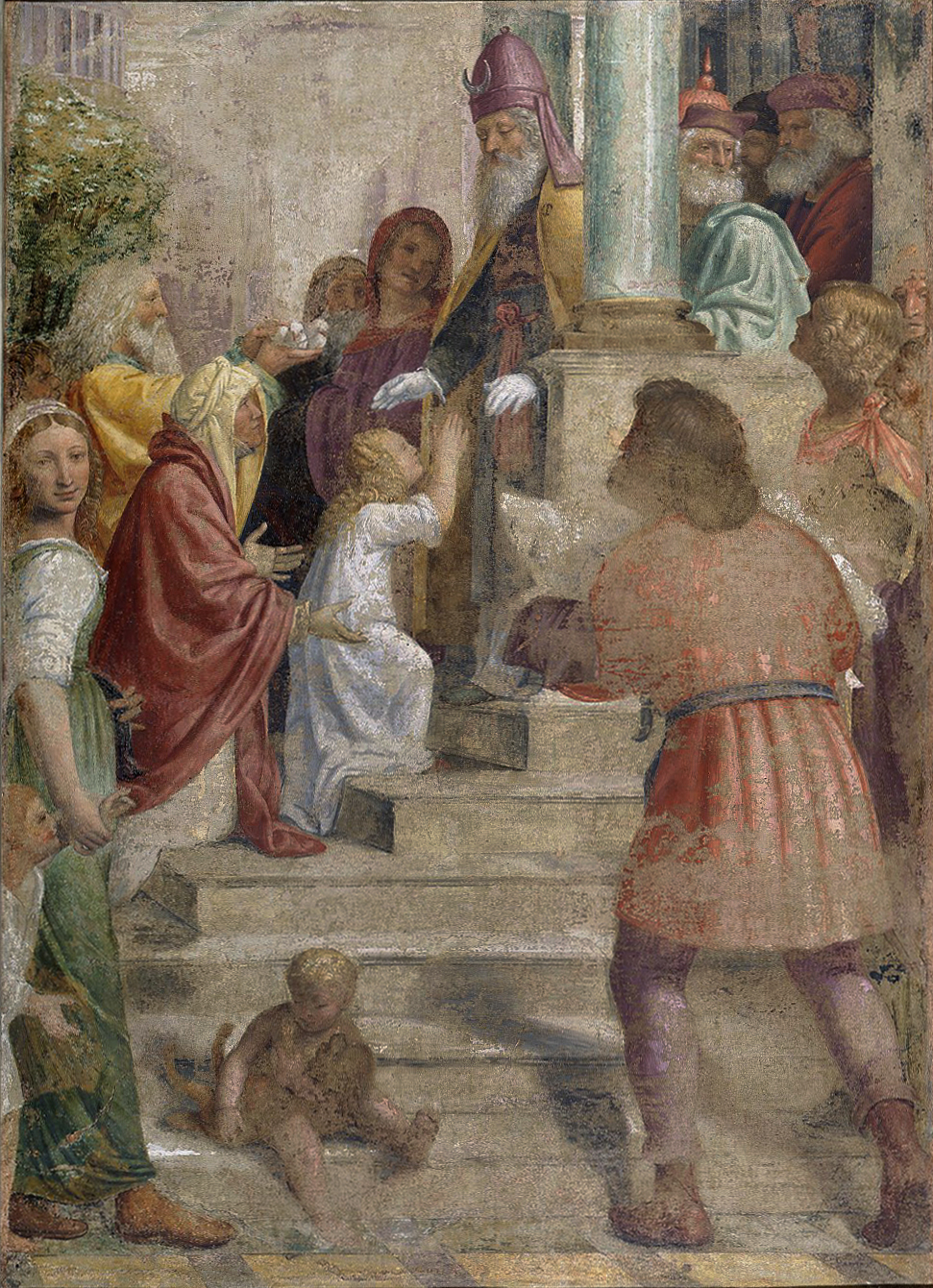 Starting from the left with the announcement of Mary’s birth to Joachim and Anna, the scenes depict episodes from the Virgin’s early life. In the background we see the angel persuading Joseph to marry Mary and the two newly-weds at prayer. At this stage in his career, Luini was influenced chiefly by Bramantino and by his friend Zenale, and he used assistants to help him paint the fresco cycle.