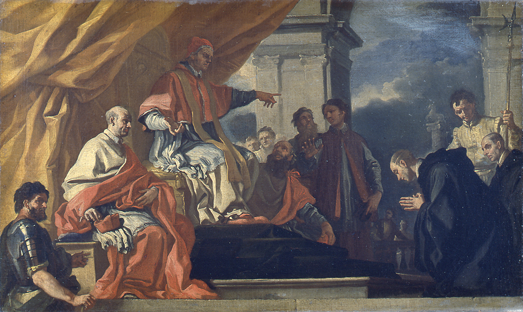 This pictue and The Meeting of Ratchis are preparatory studies for the decoration of the Chapel of St. Carloman (which housed the relics of Carloman, son of Charlemagne and brother of Pepin the Short) in the abbey of Montecassino. The chapel was destroyed by Allied bombing in 1944. The cycle, for which only a handful of studies remains, told the story of the Benedictine abbey complex, depicting episodes associated with the many figures that have marked its thousand-year history.