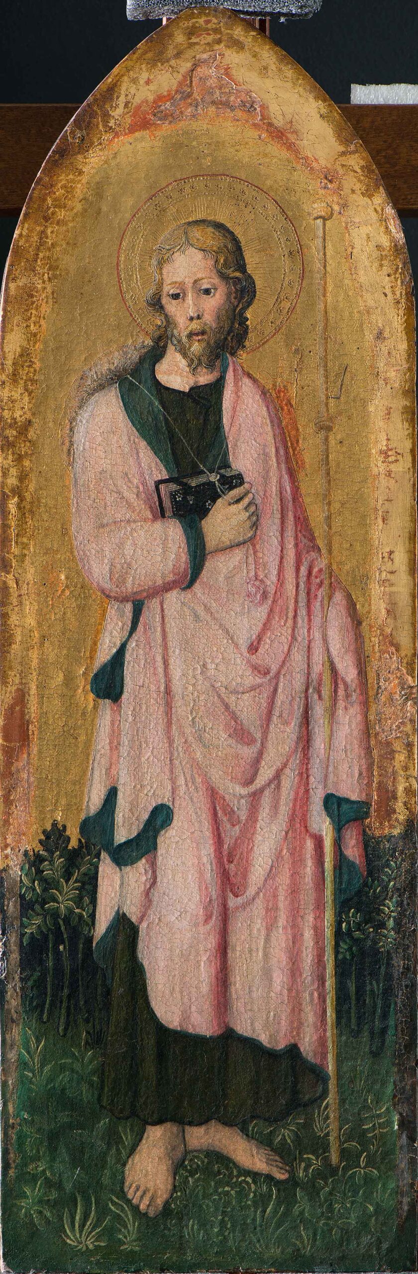 These two panels are parts of a now dispersed polyptych painted by Bonifacio Bembo, a painter and illuminator awarded numerous prestigious commissions by the Sforza court whose ideals of courtly luxury he depicted. The pale, elegant saints outlined by a thin, soft silhouette are clad in complementary, jewel-like colours. The meticulous rendering of detail, from the clothing to the grass, still echoes the masterly naturalism of Gentile da Fabriano.