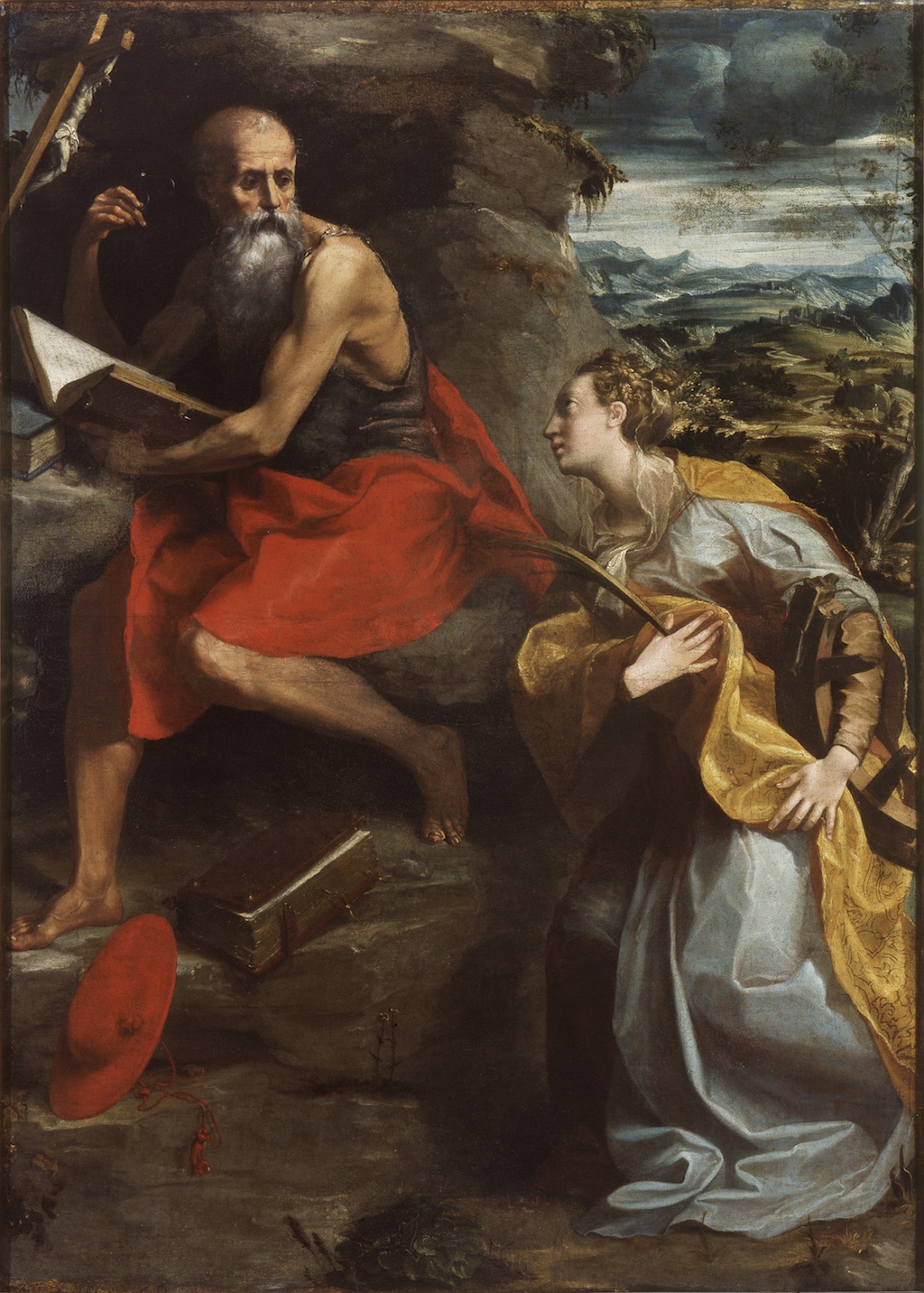 Michelangelo Anselmi was probably born in Lucca after his father was exiled from Parma on a charge of murder. He moved Parma some time before 1520, achieving renown as a painter and working with Correggio and Parmigianino. This painting comes from the Chapel of the Conception in the church of San Francesco in Parma, which Anselmi frescoed from 1532 to 1534. St. Jerome, seated on a rock, turns to St. Catherine as she adores the Crucifix.