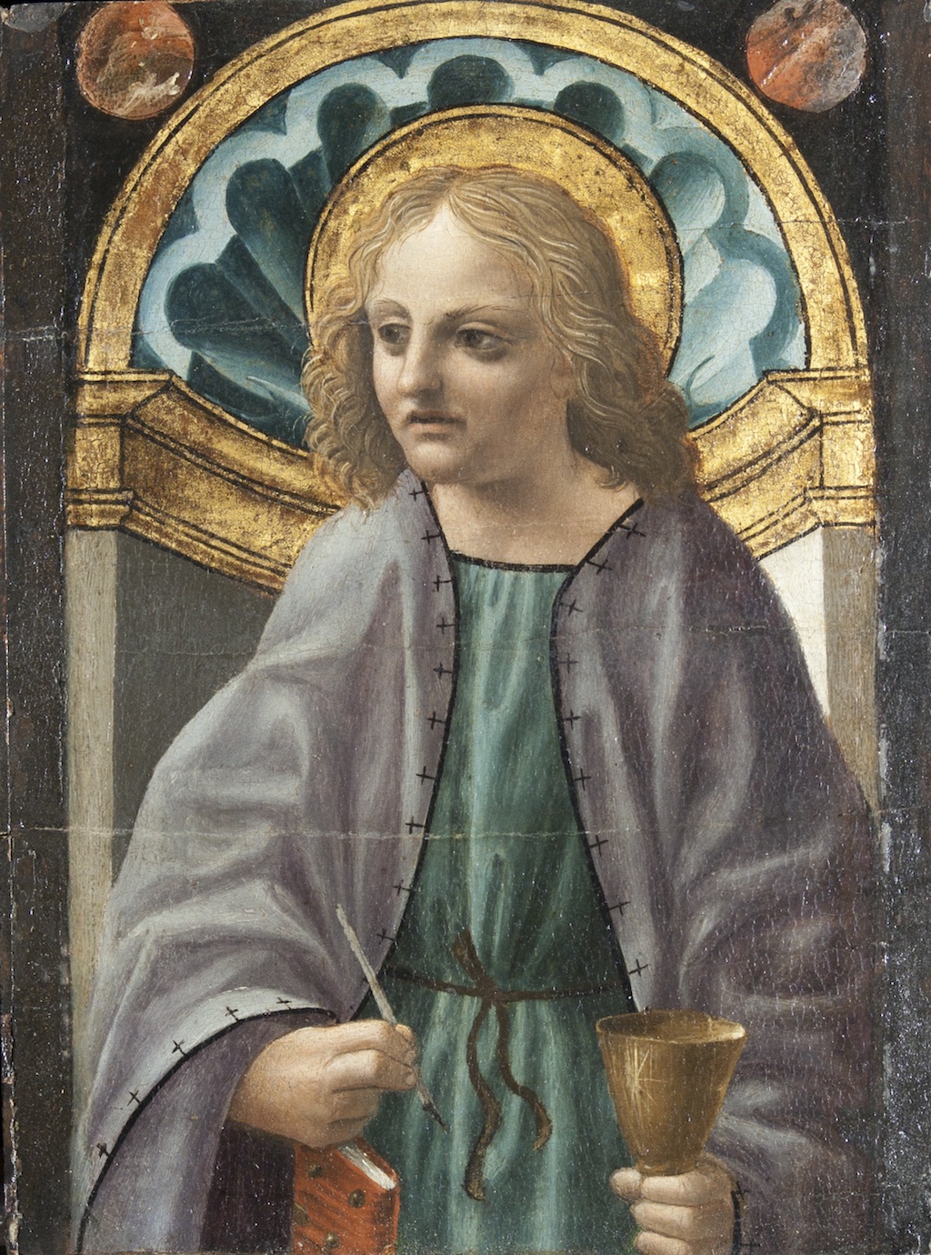 The saint is identified by his book, pen and chalice, the latter alluding to the legend that he survived a poisoned beverage fed to him by the priest of Diana in Ephesus. The painting was originally part of a predella depicting the apostles. The palette and chiaroscuro are soft, the subtle light effects echoing the work of Foppa or Butinone. These characteristics, different from the style of Leonardo found in the Sforza Altarpiece, suggest that this picture was painted at a different moment in the artist’s career.