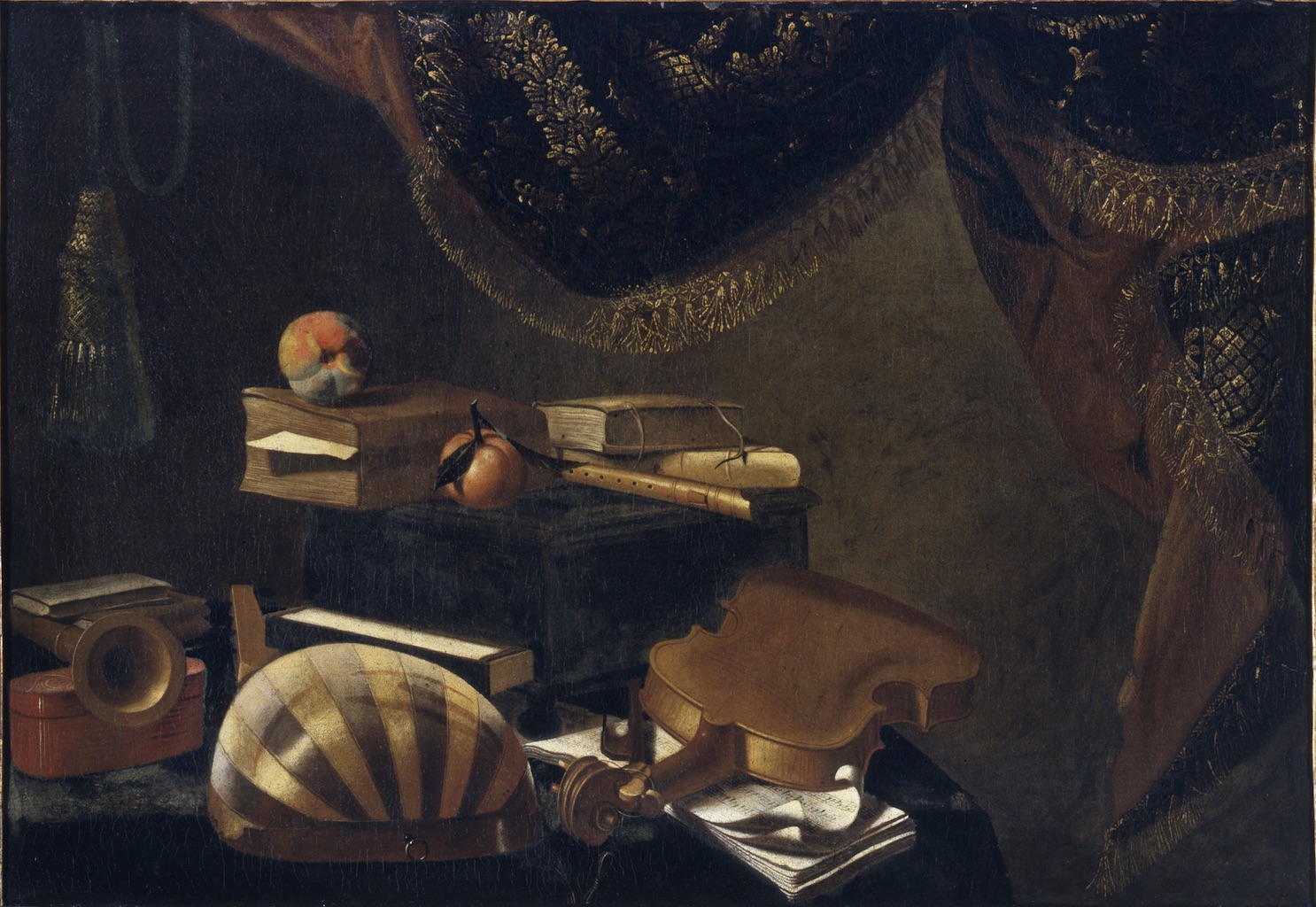 On the table, starting on the left, we see a low-pitched shawn, a mandora, a violin with a bow and a tablature, a system of musical notation for string instruments. Books, fruit and a flute before a curtain complete the composition constructed on the basis of strict scientific rules reflecting the treatises on perspective and the wooden marquetry of the 15th century. Such naturalistic details as the fingerprints in the dust on the mandora may be interpreted as a warning pointing to the inexorable passage of time.
