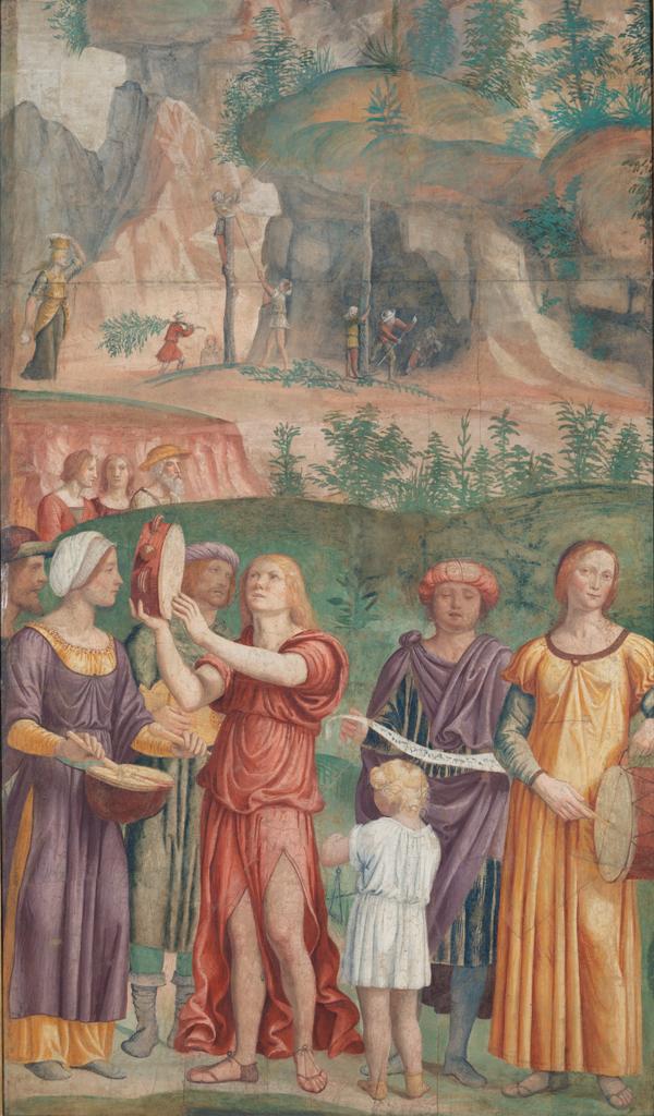The main hall in Villa Pelucca was frescoed with Stories of Moses from the book of Exodus. This scene shows the Children of Israel singing God’s praises after the Red Sea miraculously parted to let them through and then equally miraculously closed over Pharaoh’s pursuing army. Luini, who was well on the way to becoming one of Milan’s leading painters, was chiefly influenced at this stage in his career by Bramantino and Zenale, as we can see from the figures’ faces and structure.