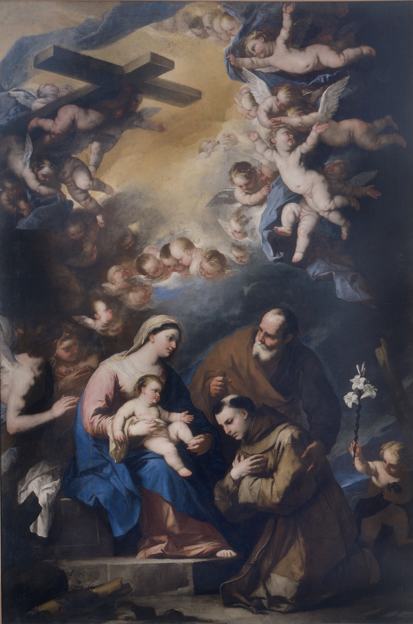 This picture is likely to have been painted by Luca Giordano during his known absence from Naples in 1664–5, when he spent time in Florence and may even have travelled as far as Venice. He has already contaminated his master Ribera’s style with a Baroque search for the painterly and the picturesque which he learnt from Mattia Preti, Rubens and Pietro da Cortona. The subject is also the appearance of the Cross to the Holy Family, which proved enormously popular in Naples.