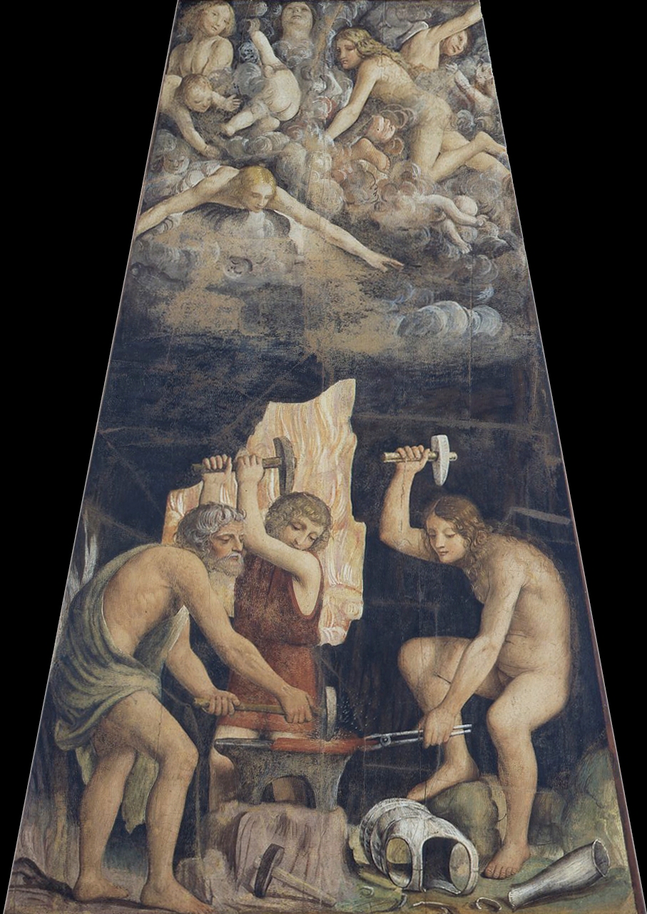 Vulcan is forging metal with his wife Venus and one of his Cyclops helpers. Above, the winds that originate in his cave break free. This rare version of Vulcan’s Forge adorned the chimney breast of the main hall in the Pelucca decorated with Stories of Moses. Gerolamo Rabia commissioned the villa’s decoration for his marriage with Ippolita Pagnani; their arms may be seen on the lintel of the fireplace, which is still in the villa, with an inscription possibly composed by Gerolamo himself.